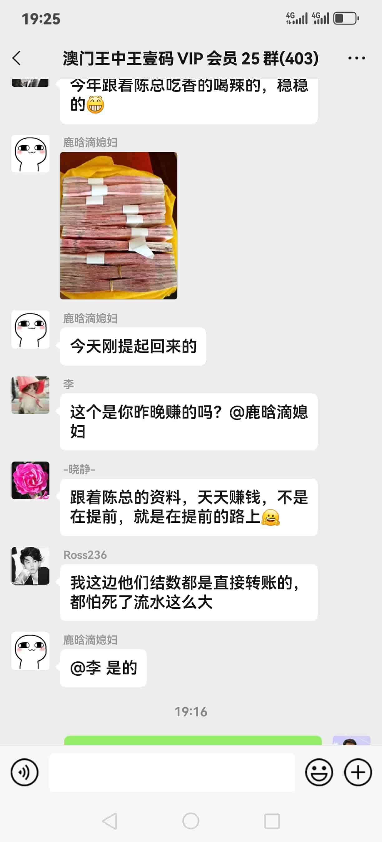 发表于14天前 陈总下午好,中午庄家才把钱打到我的卡上,刚刚在银行把钱取了出来,钱在银行卡里感觉就是数字,拿到现在在手上感觉就是不一样,我听你的钱都取现金出来存着,刚刚给你转了8888茶水费,陈总你查一下 |