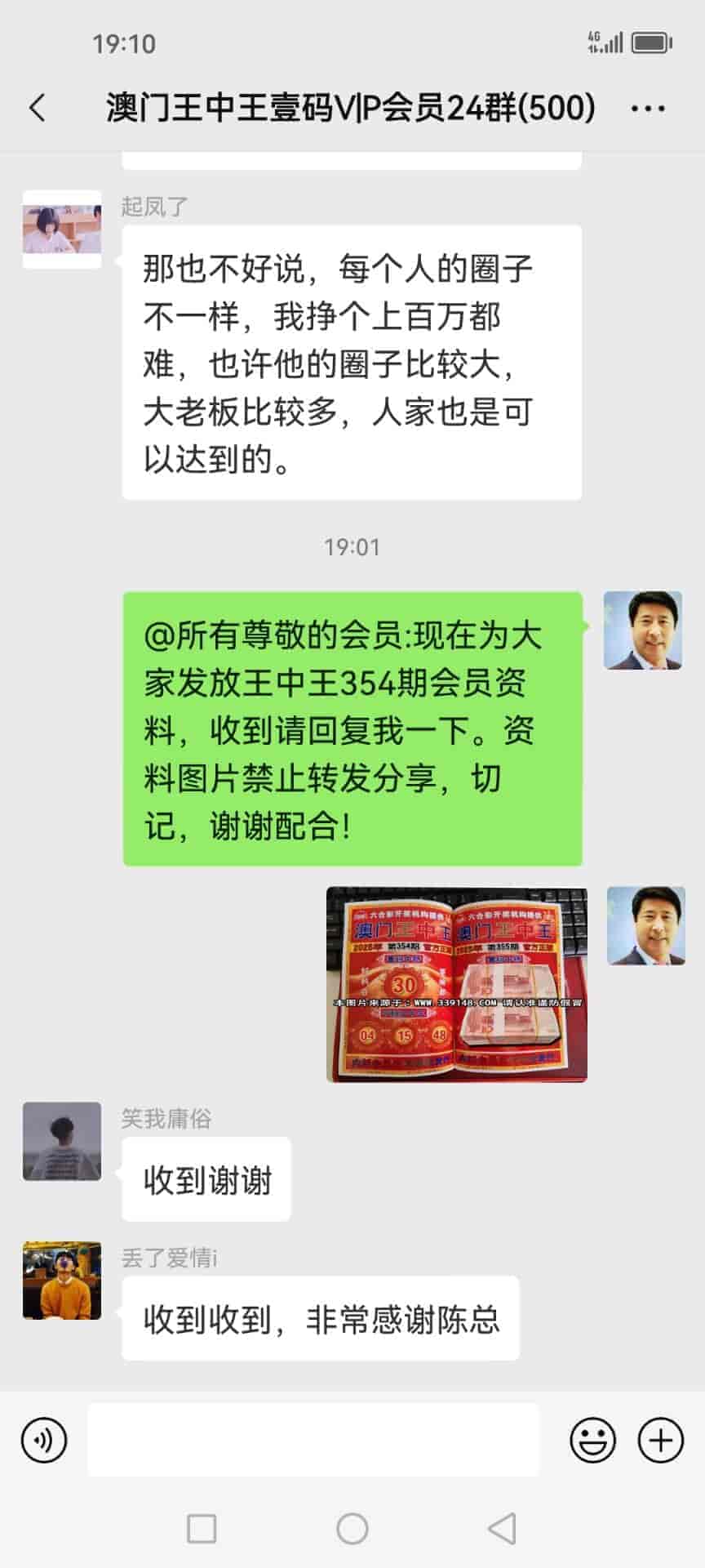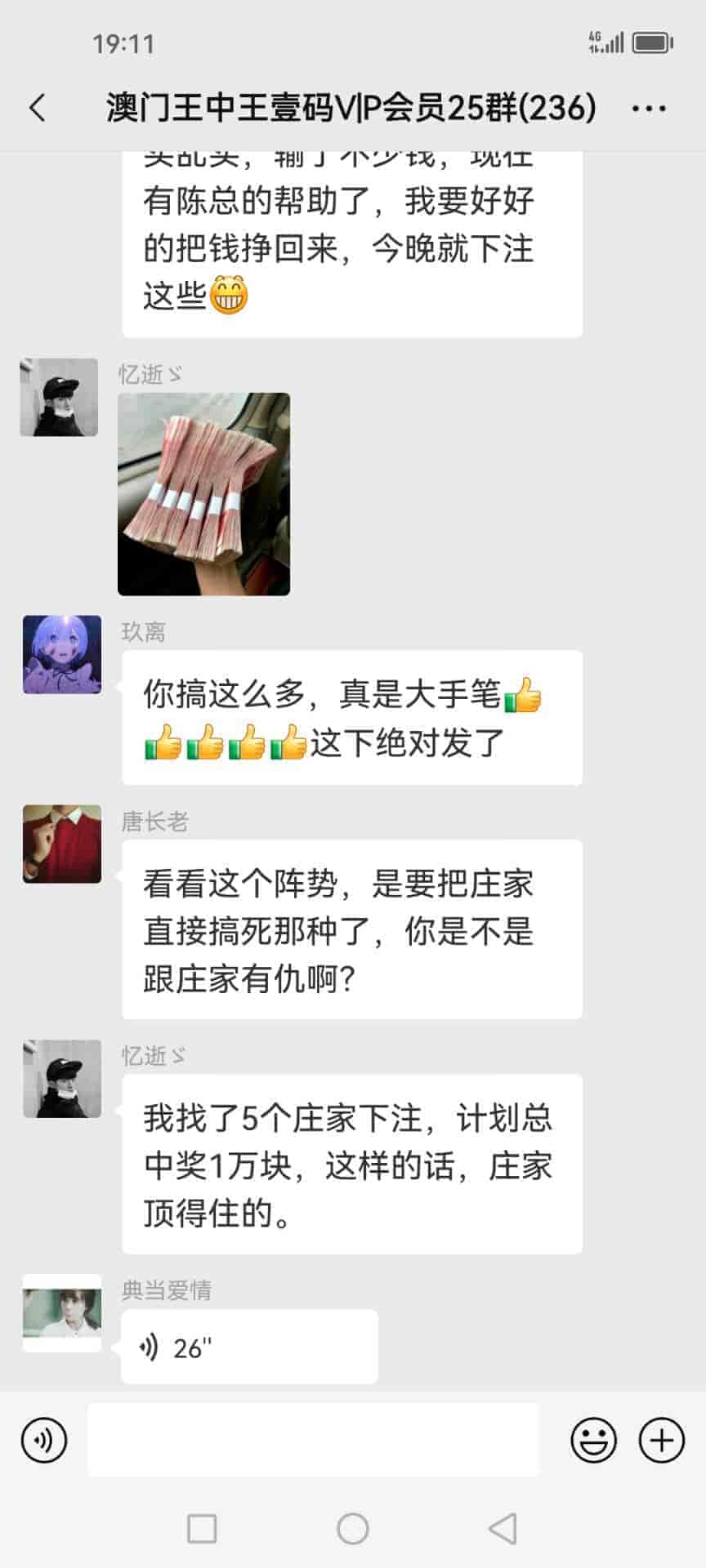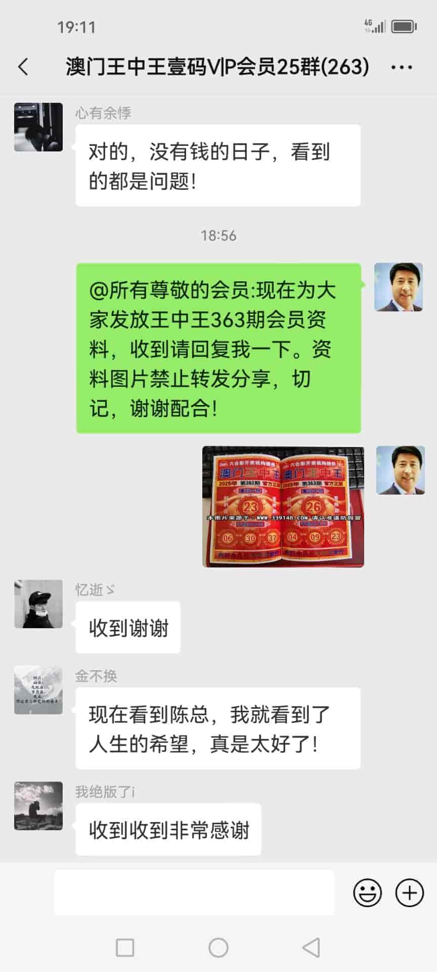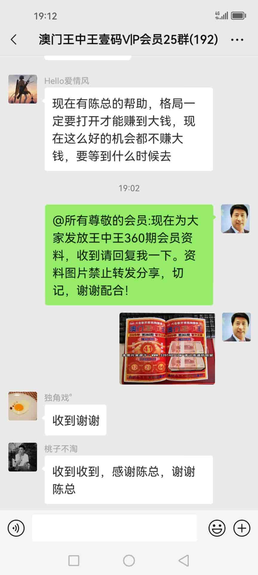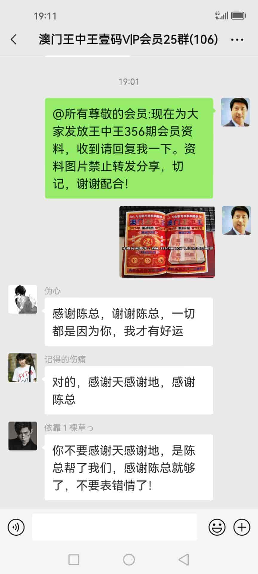 陈总你好,我是广西的何俞林跟着你的书籍资料下注已经有9期了,现在不单单把输出的30万赢了回来还转了50多万,说句心理话没有你就没有我的今天,昨晚中了奖今天下午那些庄家才陆陆续续的赔钱给我,刚刚给你转了19000元红包感谢你的,你查收一下,等我有时间一定亲自登门感谢。 |